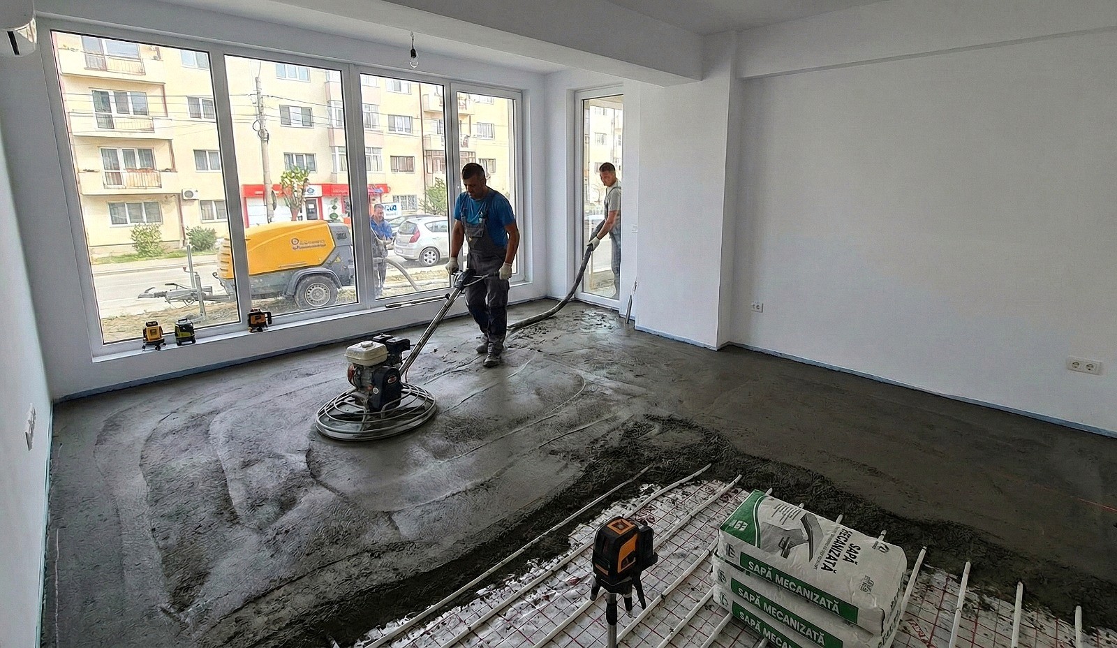 Turnam sapa mecanizata pentru pardoseli rezistente si perfect nivelate, pregatite pentru gresie, parchet sau alte finisaje. Lucram rapid, curat si cu grosimi controlate.